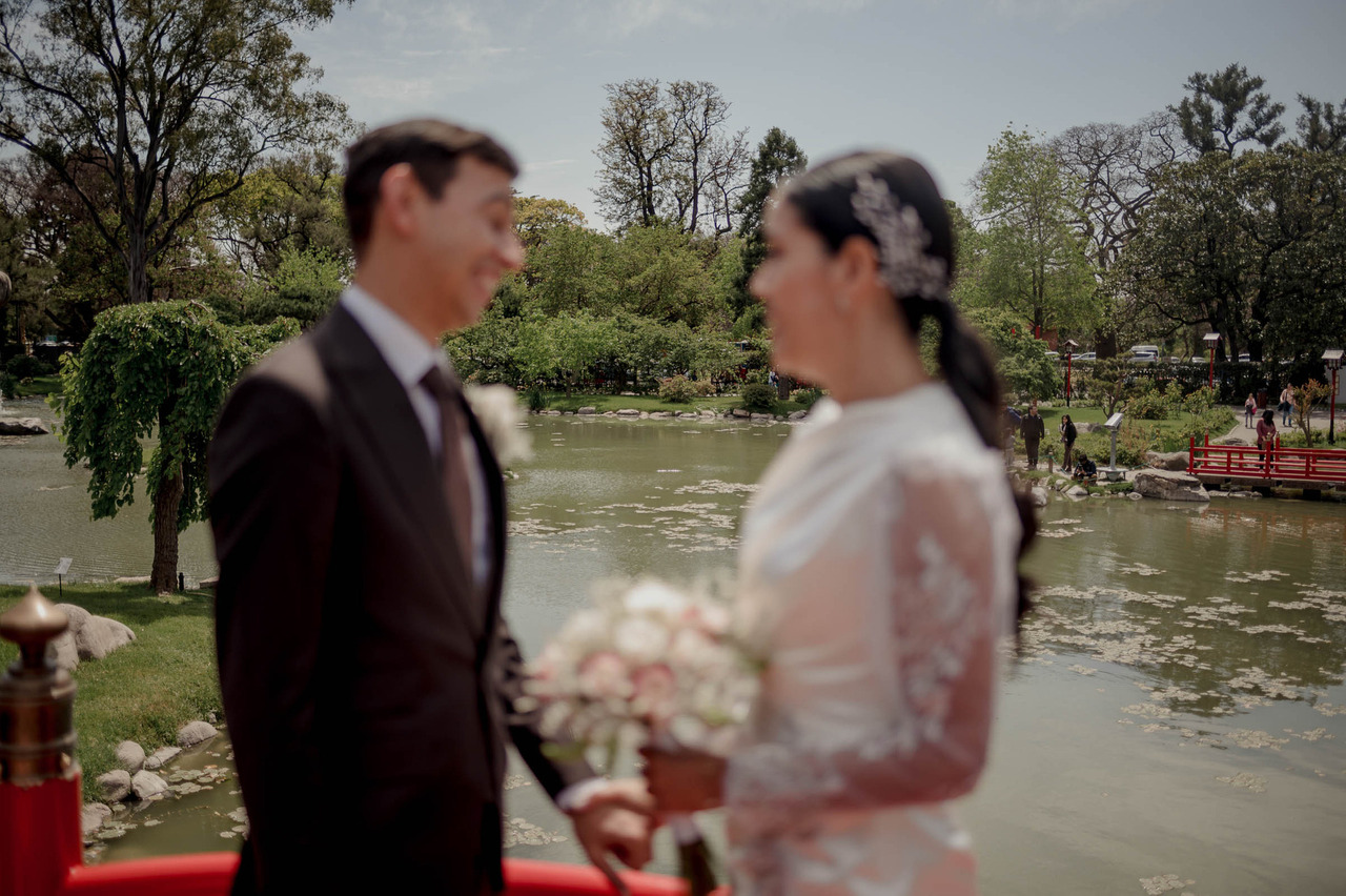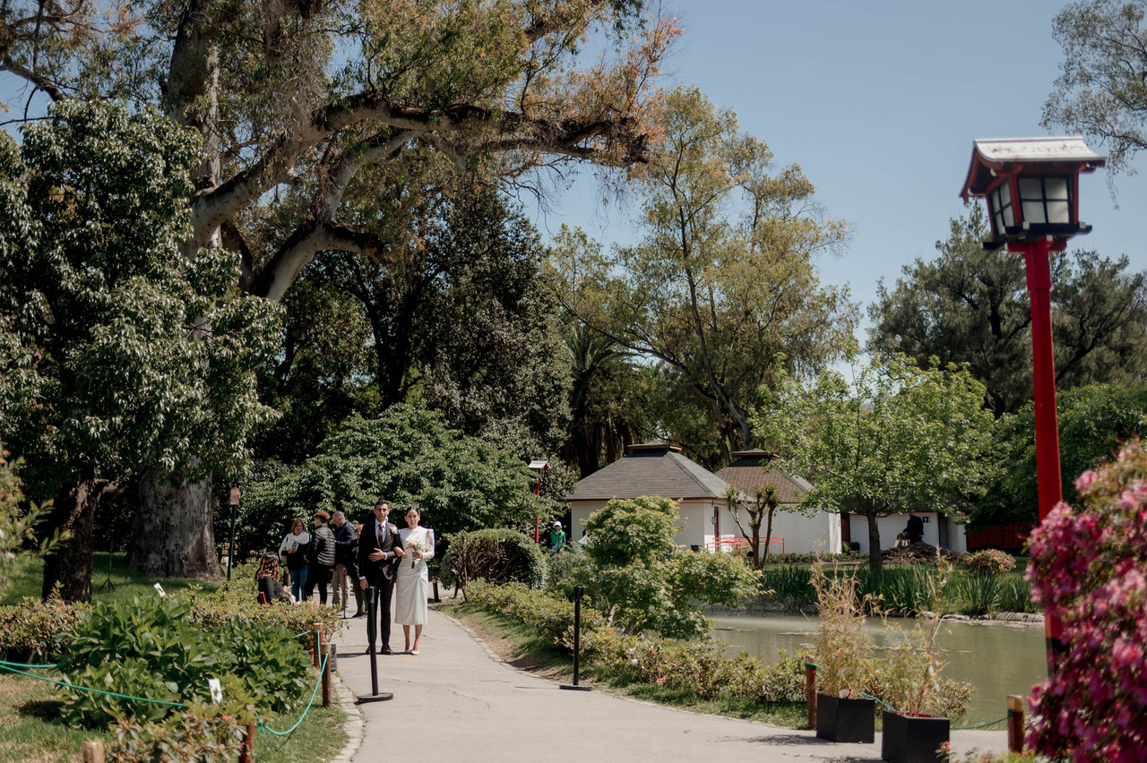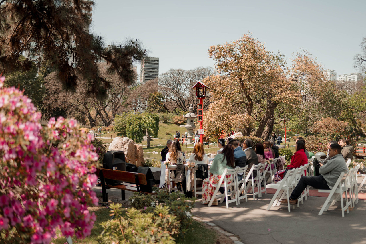 Este espacio, con su diseño paisajístico tradicional japonés, ofrece un ambiente de paz y serenidad. Los puentes de madera, la arquitectura típica y los cerezos en flor crean un entorno mágico para una boda íntima.